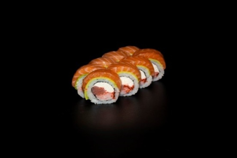 Рол з лососем, тунцем, крабом, авокадо, вершковим сиром та ікрою масага.