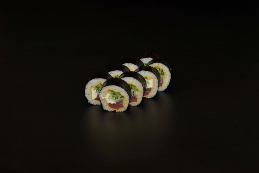 Склад: рис, норі, тунець, вершковий сир, сир чеддер, огірок.