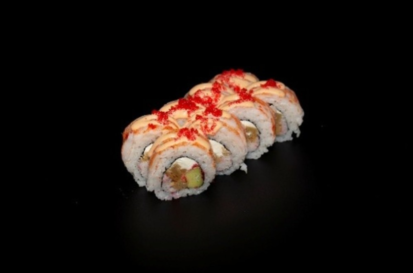Ніжний та поживний рол з креветкою, крабом, авокадо, омлетом, вершковим сиром та горіховим соусом, посипаний ікрою масага.