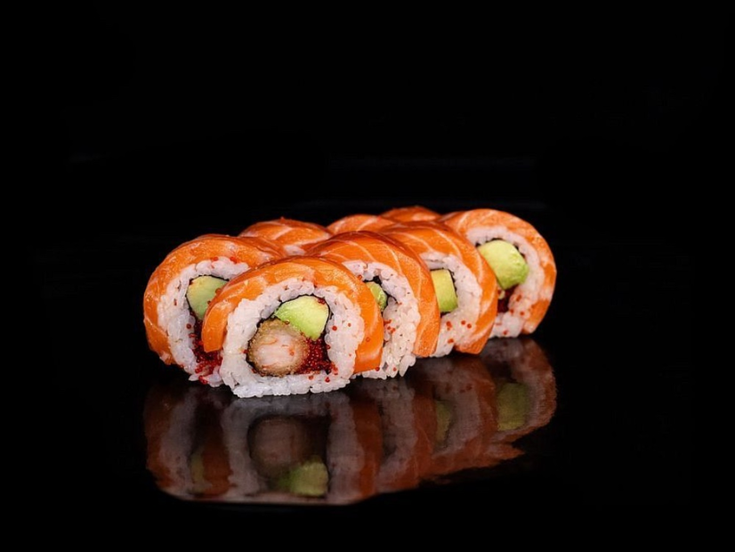 Рол з креветкою темпура, авокадо, ікрою масага та свіжим лососем.