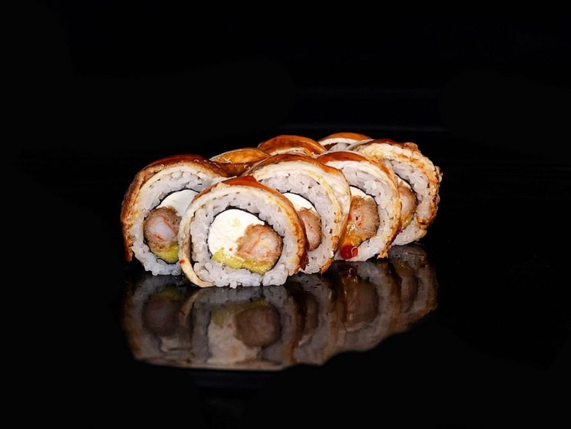 Солодко-гострий рол з вугрем, креветкою темпура, манго, вершковим сиром та соусом солодкий чилі.