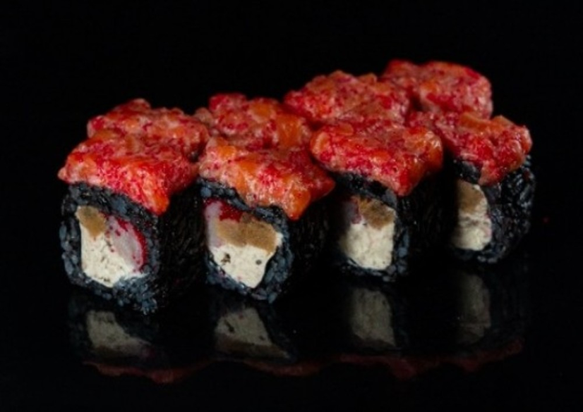 Чорний рол з лососем, крабом, омлетом, вершковим сиром та ікрою масага.