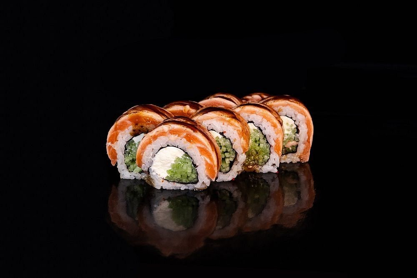 Рол з лососем-гриль, вершковим сиром та соусом унагі.