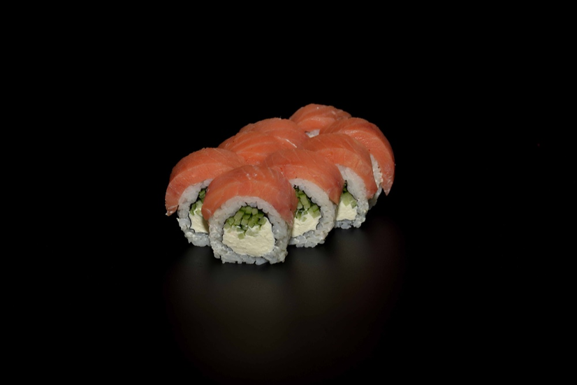 Склад: рис, норі, копчений лосось, вершковий сир, огірок.